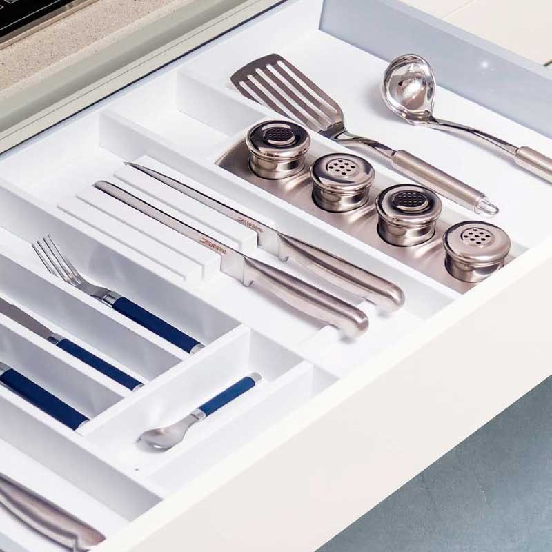 Accesorio portaespecias con 4 botes inox para hueco (B) de los cuberteros lacados en color blanco mate, terminación y diseño espectacular y de alta calidad.