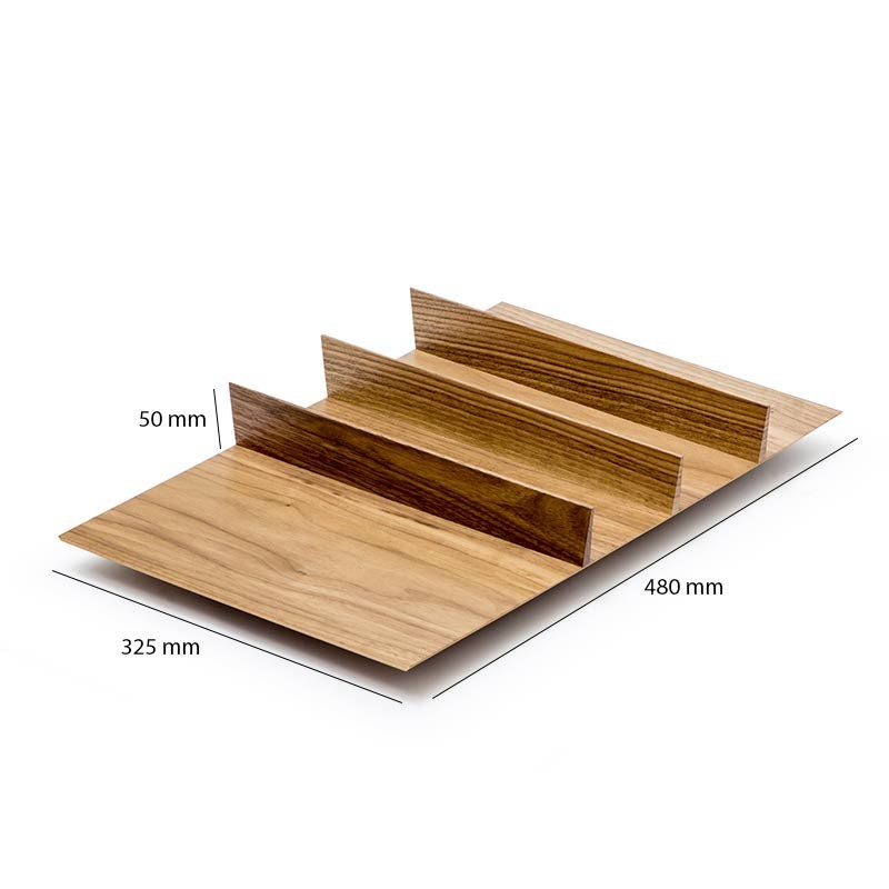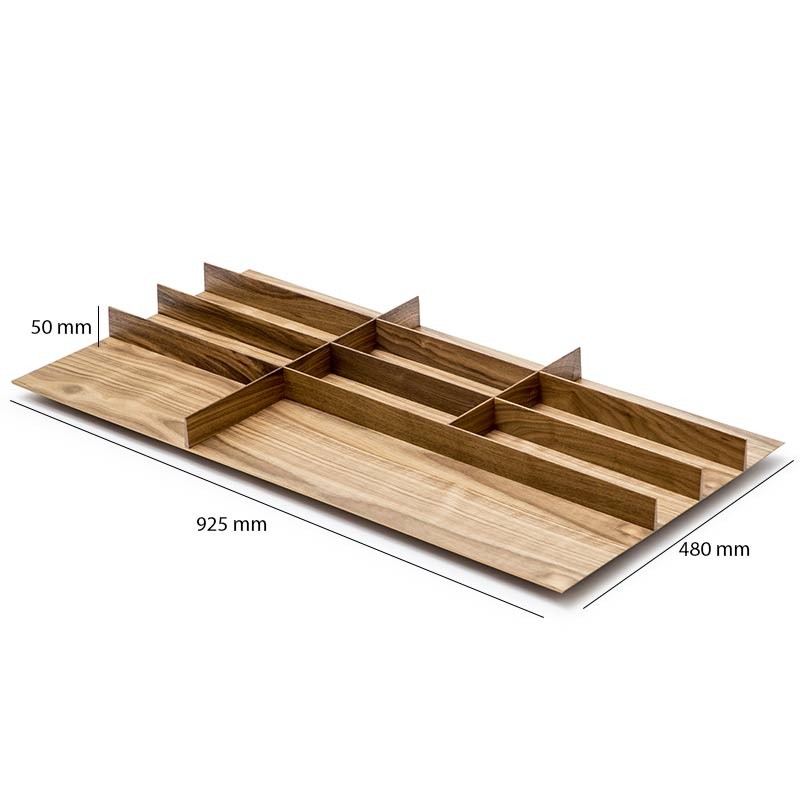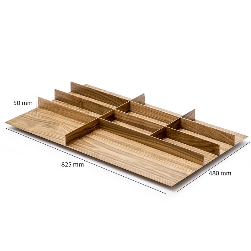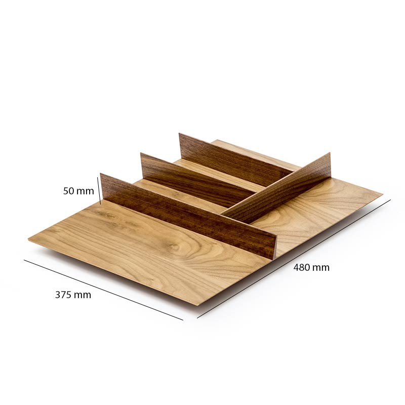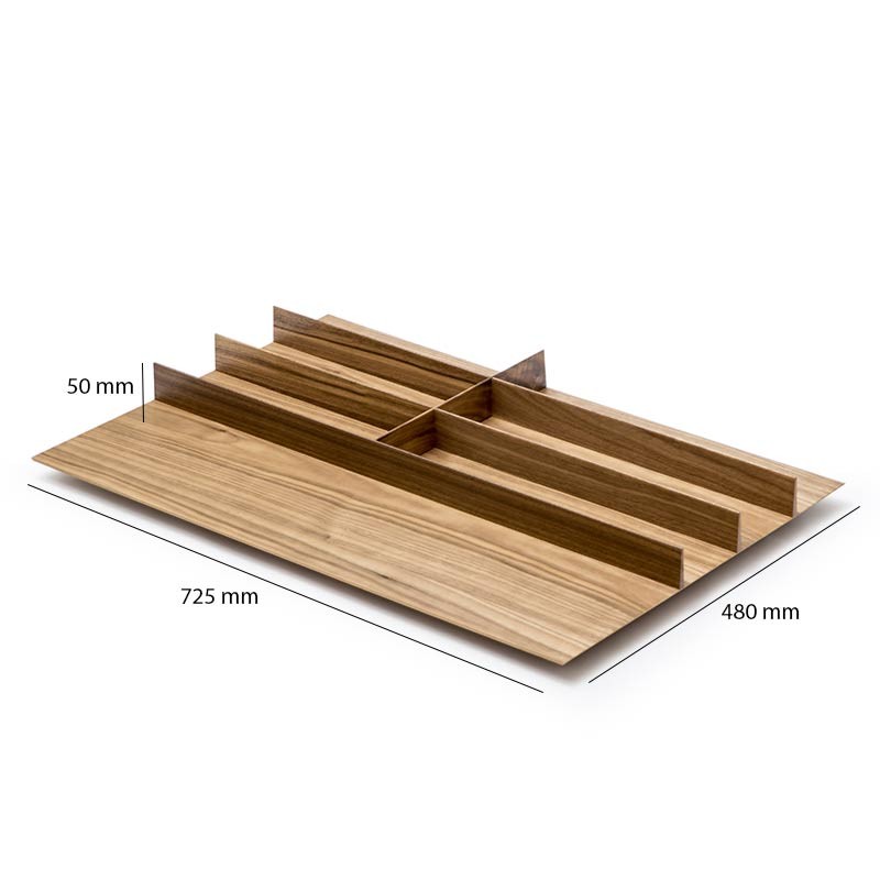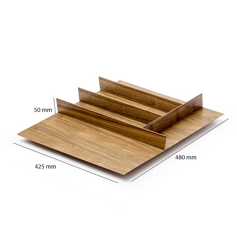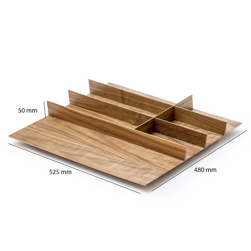 La serie Fineline de Cucine Oggi, son cuberteros fabricados en base DM con 4 mm de chapa de nogal americano y divisiones triangulares, disponible en varias medidas.