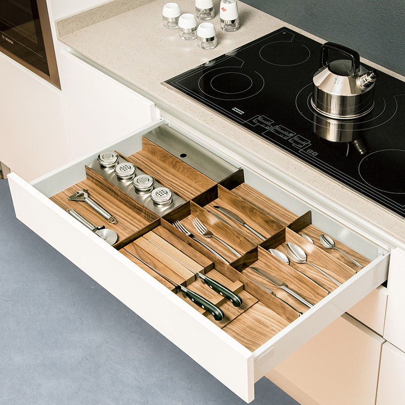 La Serie Fineline de Cucine Oggi representa una evolución en el diseño de cuberteros de madera, fabricados en base DM con 4 mm de chapa de nogal americano. Sus divisiones triangulares aportan mayor calidad estética y funcional para mantener una organización práctica y elegante.