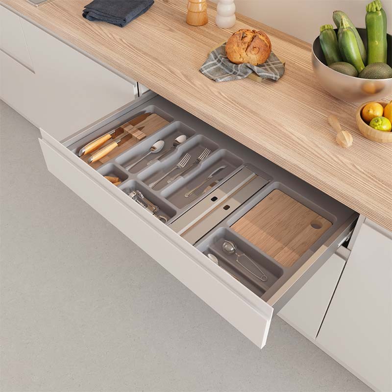 Cubertero modular para cajón de cocina fabricado en polipropileno color gris, blanco o antracita a elegir. Adaptable a cualquier cajón.