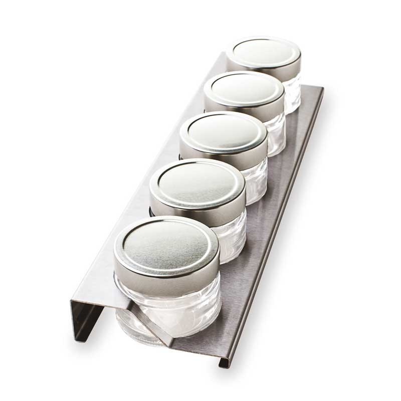 Portaespecias de acero inoxidable con 5 especieros de cristal para cubertero de cocina modelo Premiere.