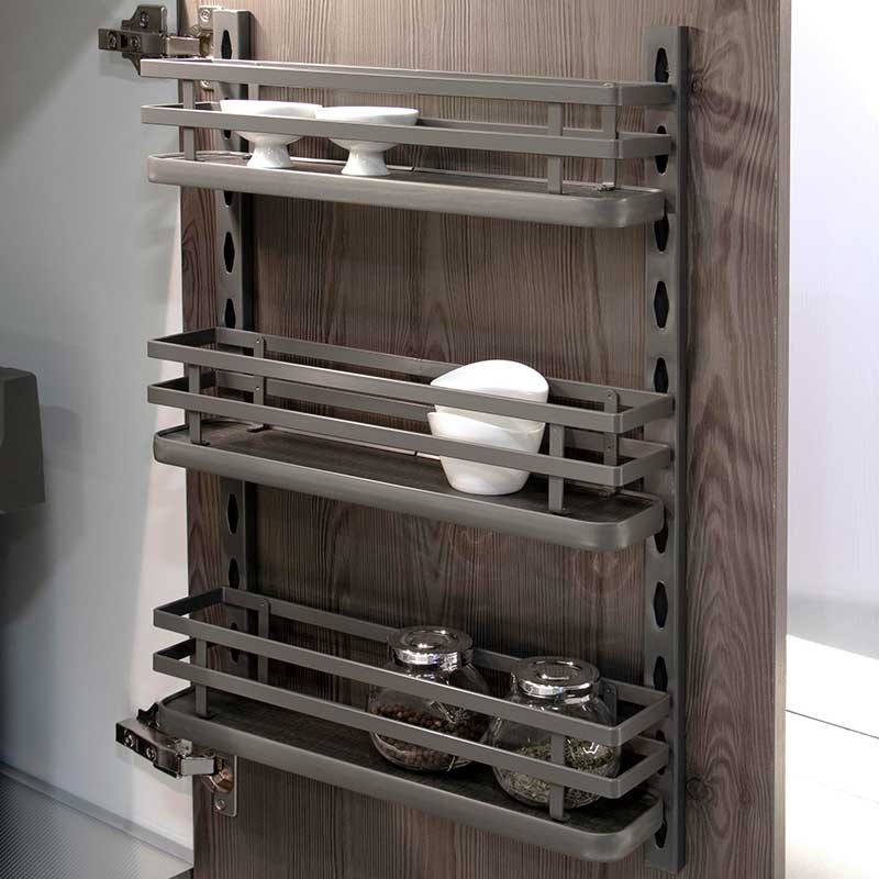 Especiero con 3 bandejas de acero color antracita modelo Titane para instalar en el interior de un mueble de cocina o para anclar a la pared.