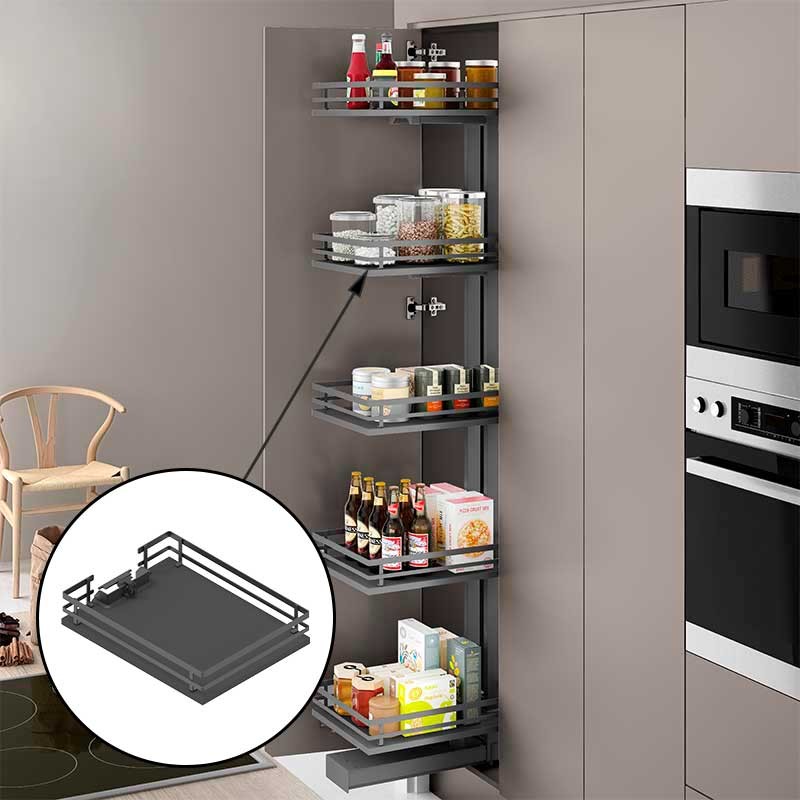 Cestillo para despensero extraíble columna modelo Titán Línea Flat fabricado en acero antracita con base de melamina antracita.