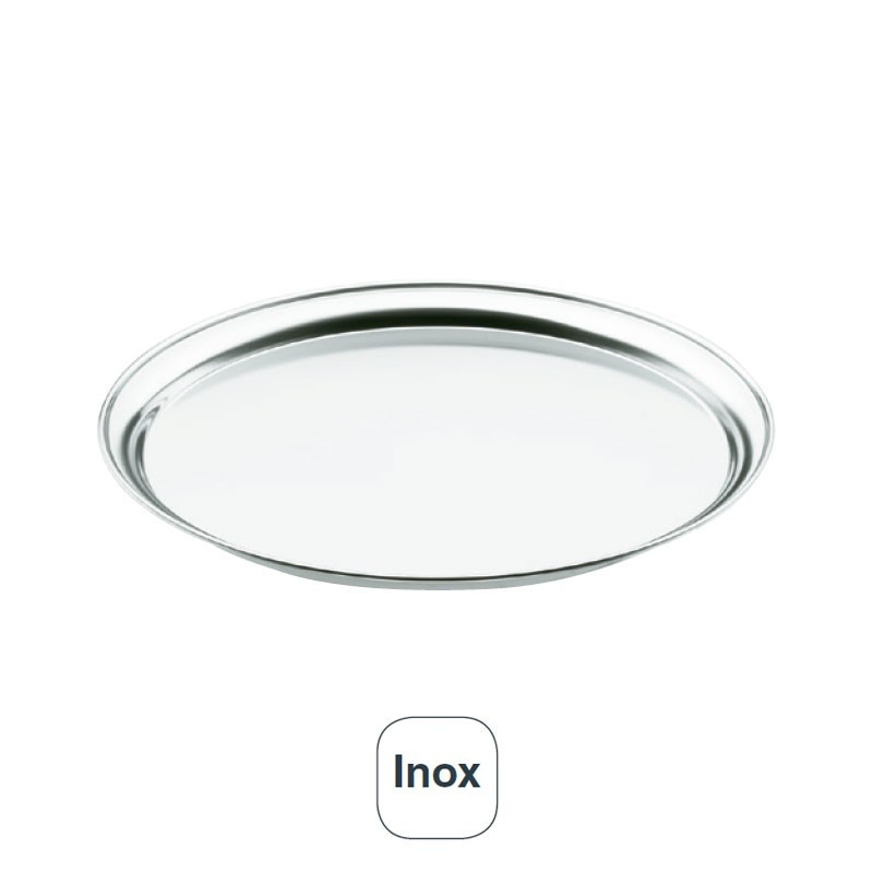 Bandeja de camarero redonda fabricada en acero inoxidable, material liso, no poroso y muy higiénico que ofrece una excelente resistencia a la corrosión.