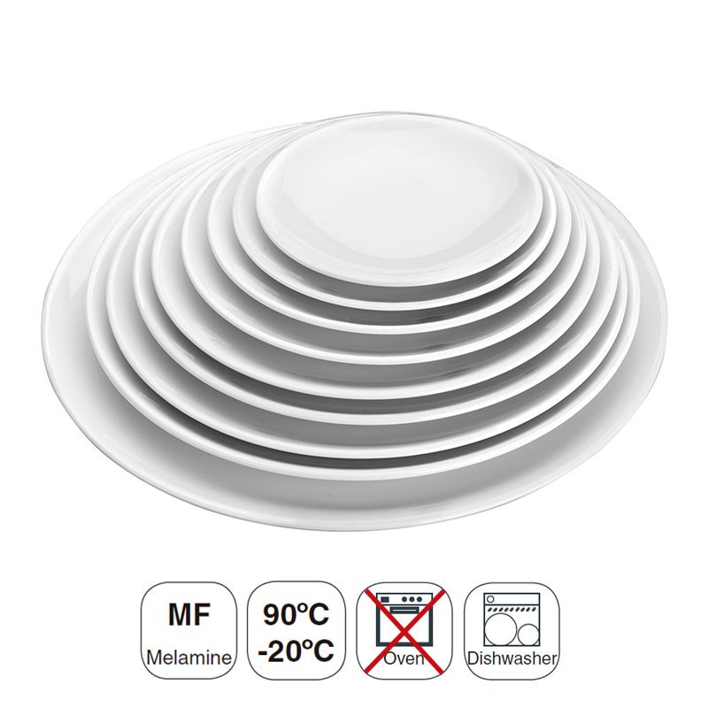 Bandeja redonda serie Melamina fabricada en resina sintética de gran resistencia y apta para lavavajillas. Disponible en varias medidas.