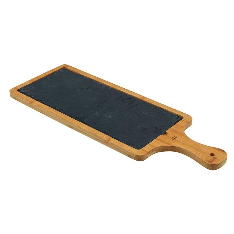 Tabla con mango con una base en pizarra natural extraíble ideal para presentar y servir.