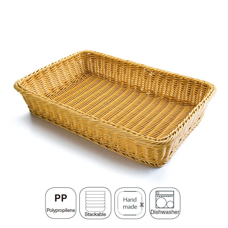 Cesta de pan cuadrada y apilable fabricada a mano en polipropileno de gran resistencia apto para lavavajillas. Ideal para hostelería y restauración. Medidas: 53X33,5X9 cm.