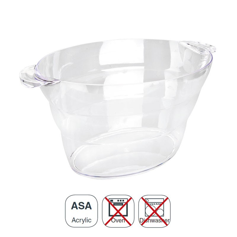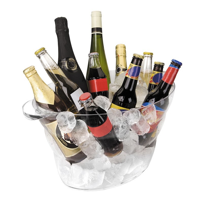 Barreño grande para meter hielo y enfriar botellas de 47x29x23 cm y 13 litros de capacidad fabricado en plástico acrílico transparente.