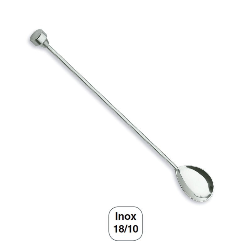 Cucharilla de 24,5 cm de largo para preparación de cócteles, y fabricada en acero inoxidable de gran calidad y resistencia a la corrosión.
