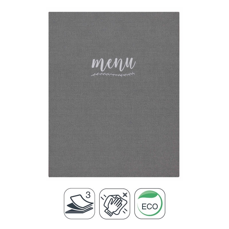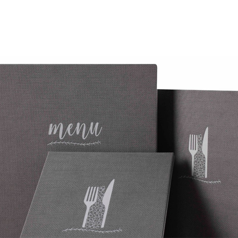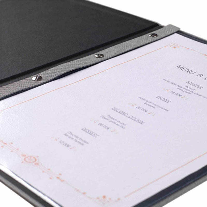 Portamenús colección Francis fabricados en simil piel con termosellado en color blanco y fundas de PVC con atornillado interior. Ideal para hostelería y restauración. Tamaño a elegir.