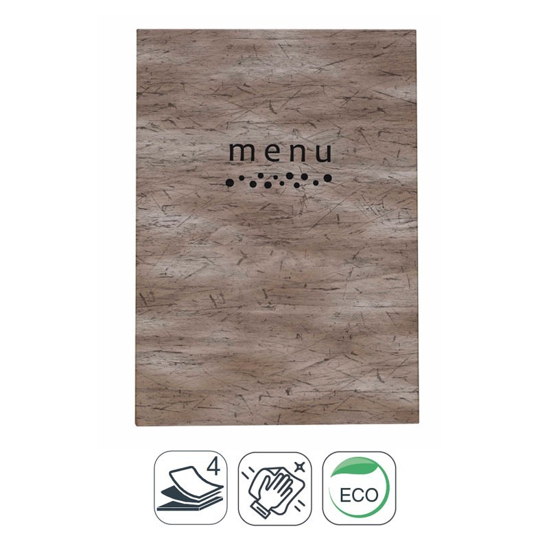 Portamenús colección Andy fabricados en simil piel con termosellado en color negro y fundas fijas de PVC. Ideal para hostelería y restauración. Tamaño a elegir.