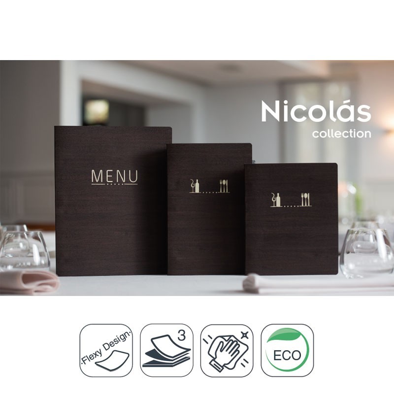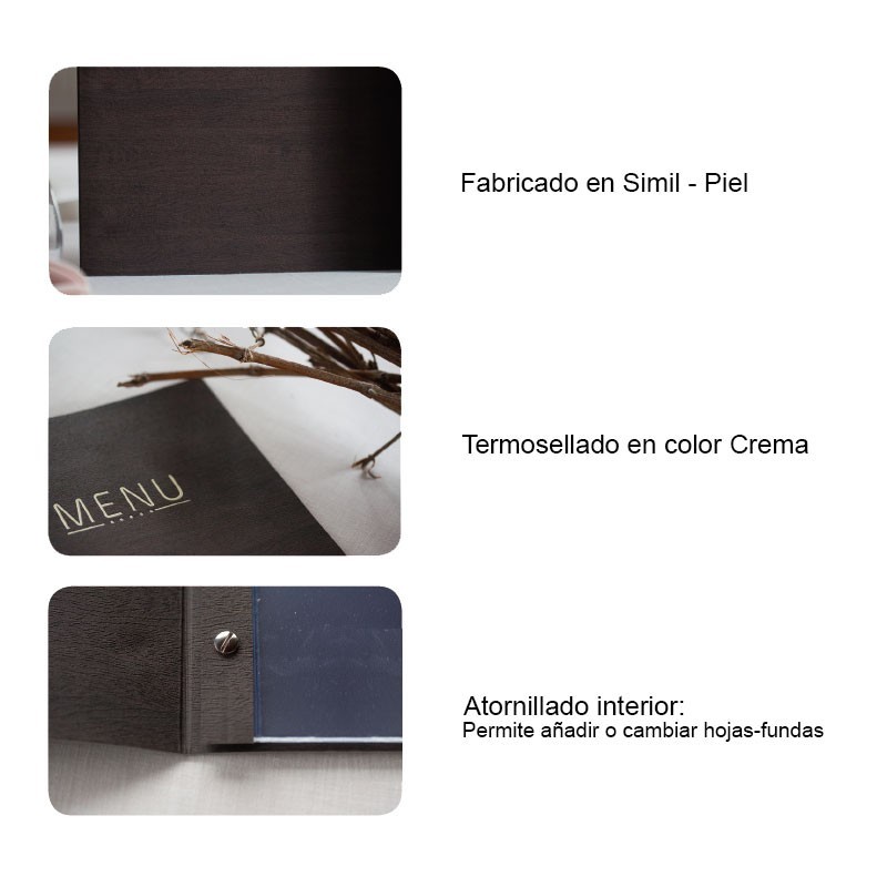 Portamenús colección Nicolás fabricados en simil piel flexible con termosellado en color crema y fundas de PVC con atornillado interior. Ideal para hostelería y restauración. Tamaño a elegir.