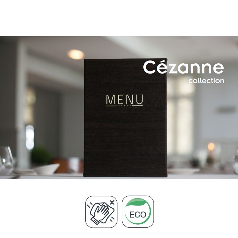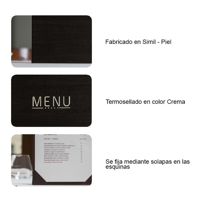 Portamenús colección Cézane fabricados en simil piel flexible con termosellado en color crema y solapas fijas a la cubierta. Ideal para hostelería y restauración. Tamaño A4: 23x32 cm.
