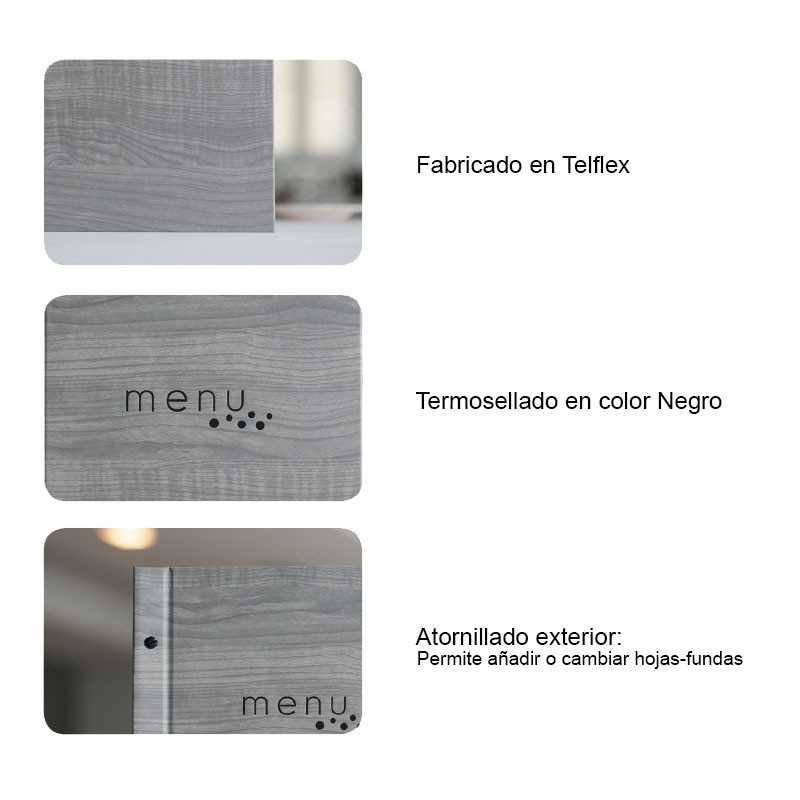 3 Fundas de PVC piel de naranja, flexibles, duraderas y altamente resistentes, sujetas mediante atornillado exterior que permite añadir o cambiar hojas o fundas según la necesidad del cliente.