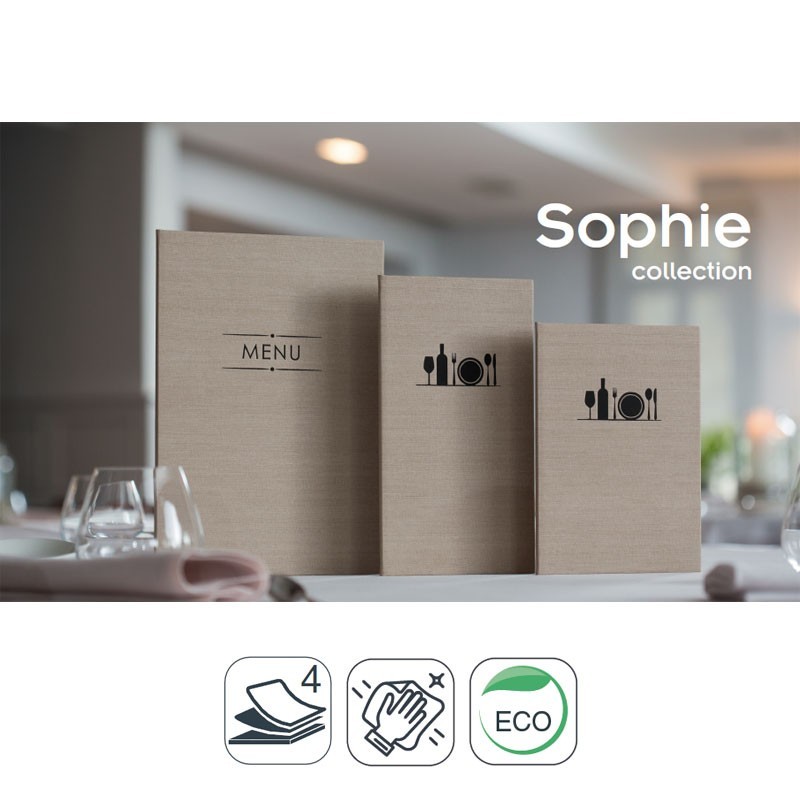 Portamenús colección Sophie fabricados en Telflex con termosellado en color negro y fundas fijas de PVC. Ideal para hostelería y restauración. Tamaño a elegir.