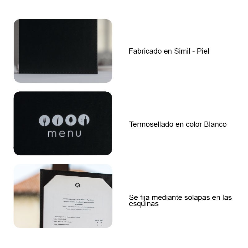 Portamenús colección Marie fabricados en simil piel flexible con termosellado en color blanco y solapas fijas a la cubierta. Ideal para hostelería y restauración. Tamaño A4: 23x32 cm.