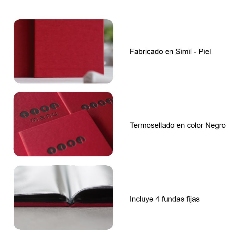 Portamenús colección Millet fabricados en simil piel con termosellado en color negro y fundas fijas de PVC. Ideal para hostelería y restauración. Tamaño a elegir.