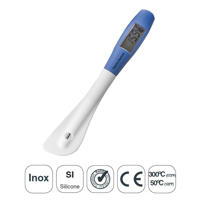 Espátula de silicona con termómetro sonda y display digital para medir temperaturas de líquidos o alimentos con un rango desde -50ºC hasta 300ºC. Largo: 29 cm