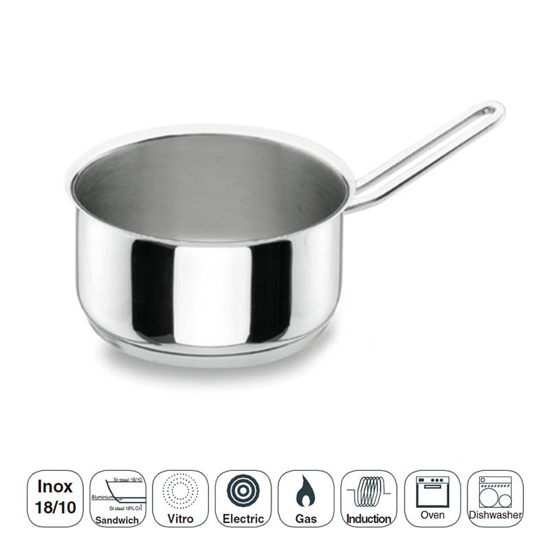 Cazo recto para cocina fabricado en acero inoxidable 18/10 y fondo termodifusor sándwich apto para placas de inducción, eléctricas, vitrocerámicas y cocinas de gas.
