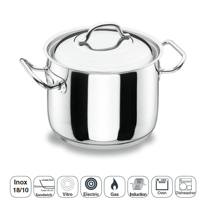Olla con tapa para cocina fabricada en acero inoxidable 18/10 y fondo termodifusor sándwich apto para placas de inducción, eléctricas, vitrocerámicas y cocinas de gas.