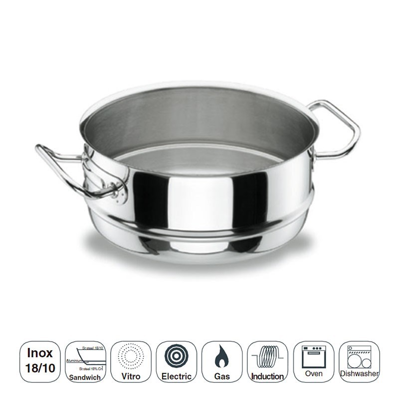 Cacerola para cocinado a vapor fabricada en acero inoxidable 18/10 y fondo termodifusor sándwich apto para placas de inducción, eléctricas, vitrocerámicas y cocinas de gas.