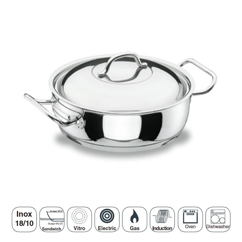 Tartera con tapa para cocina fabricada en acero inoxidable 18/10 y fondo termodifusor sándwich apto para placas de inducción, eléctricas, vitrocerámicas y cocinas de gas.