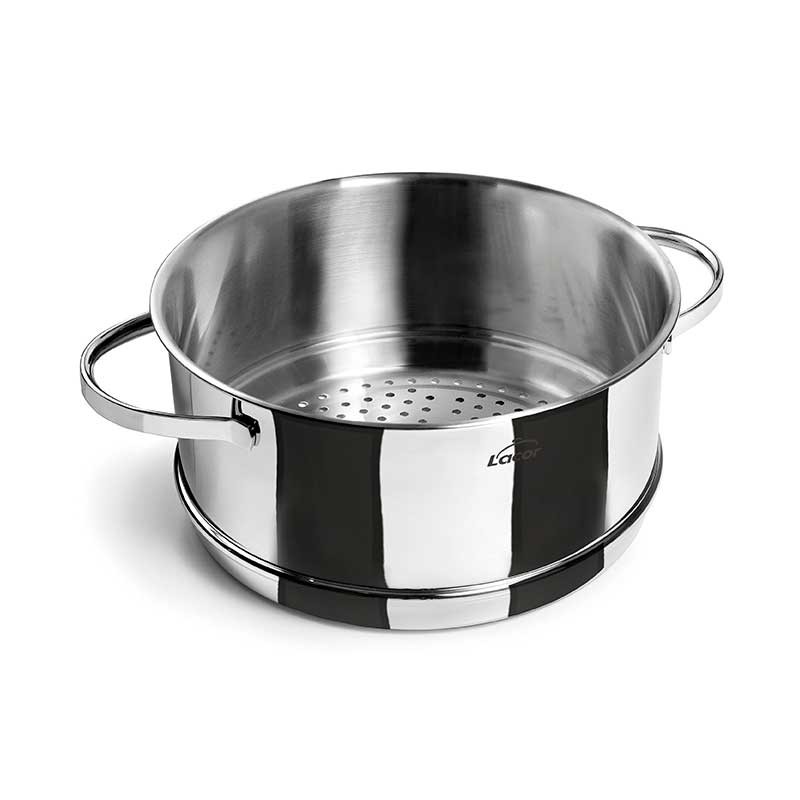 Cacerola para cocinado a vapor modelo Belly fabricada en acero inoxidable 18/10 con fondo termodifusor sándwich apto para placas de inducción, eléctricas, vitrocerámicas y cocinas de gas.