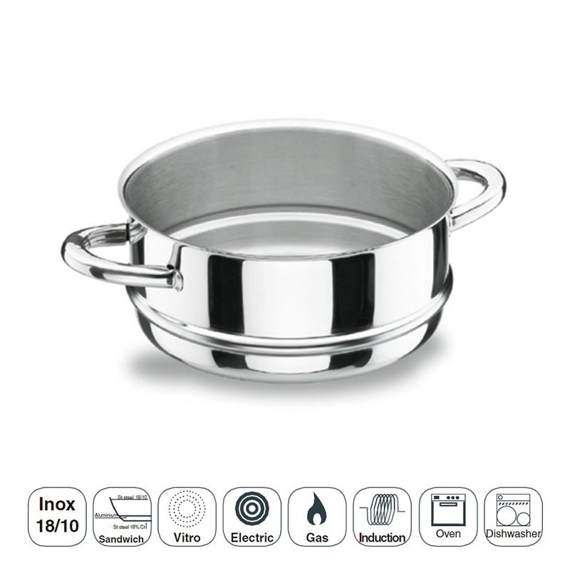 Cacerola para el cocinado de alimentos a vapor fabricada en acero inoxidable 18/10 de alta calidad que ofrece una excelente resistencia a la corrosión y a los ácidos alimentarios y sales.