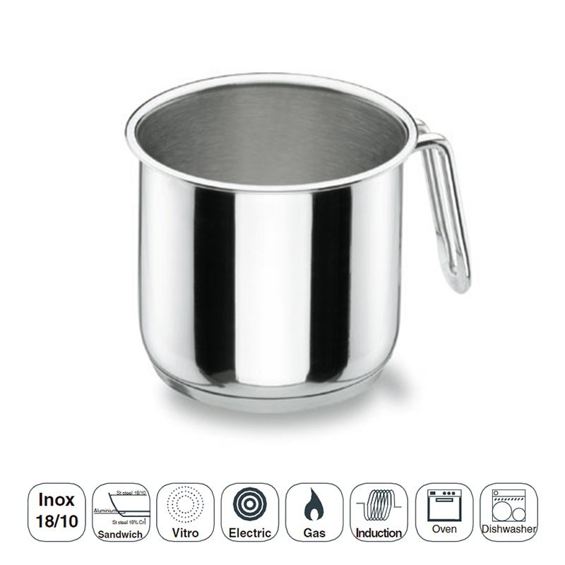 Pote cilíndrico modelo Gourmet fabricado en acero inoxidable 18/10 con fondo termodifusor sándwich apto para placas de inducción, eléctricas, vitrocerámicas y cocinas de gas.