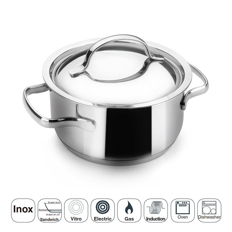 Cacerola con tapa modelo Basic fabricada en acero inoxidable con fondo termodifusor sándwich apto para placas de inducción, eléctricas, vitrocerámicas y cocinas de gas.