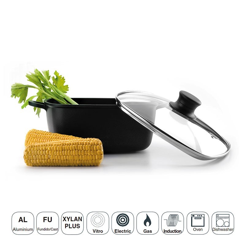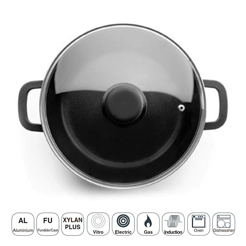 Cacerola de aluminio fundido antiadherente modelo Forte con tapa de cristal templado, válida para placas de inducción, eléctricas, vitros y cocinas de gas.