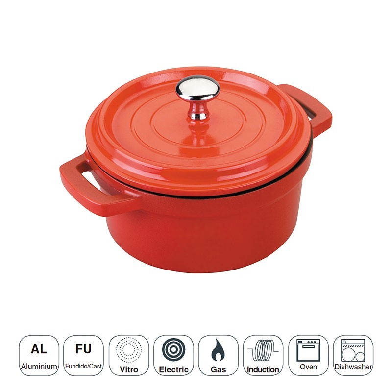 Cacerola mini con tapa fabricada en aluminio fundido antiadherente con acabado exterior rojo, válida para placas de inducción, eléctricas, vitros y cocinas de gas.