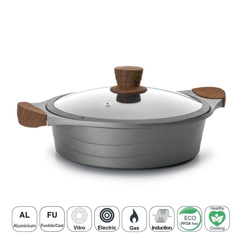 Cacerola baja para cocina modelo Stilo fabricada en aluminio fundido con tapa de cristal apta para placas de inducción, eléctricas, vitrocerámicas y cocinas de gas.