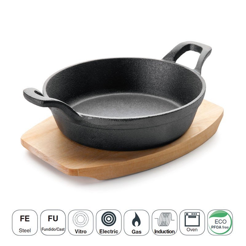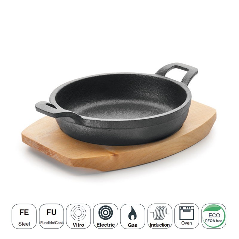 Cacerola redonda para cocina modelo Magma fabricada en hierro fundido en una sóla pieza apta para placas de inducción, eléctricas, vitrocerámicas y cocinas de gas. Incluye base de madera.