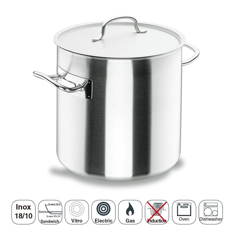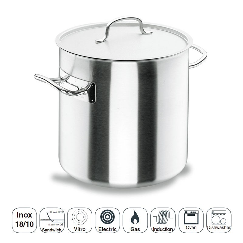 Olla recta profesional con tapa modelo Chef Classic fabricada en acero inoxidable 18/10 extra con fondo termodifusor sándwich apto para placas de inducción, eléctricas, vitrocerámicas y cocinas de gas.