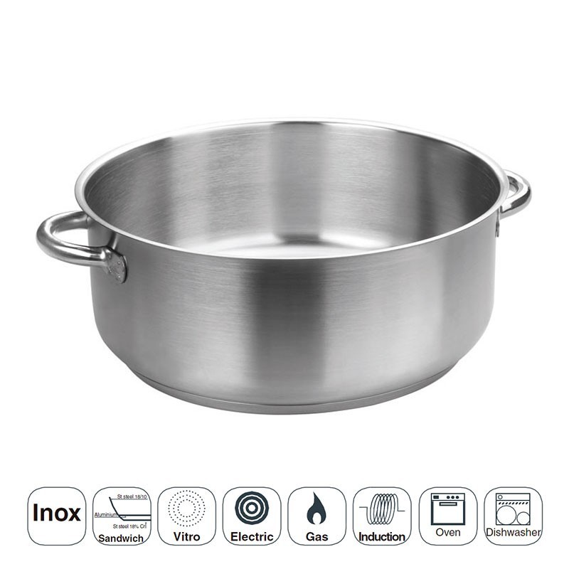Cacerola profesional modelo Eco Chef fabricada en acero inoxidable con fondo termodifusor sándwich apto para placas de inducción, eléctricas, vitrocerámicas y cocinas de gas.