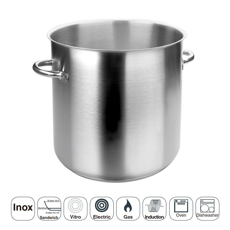 Olla recta profesional modelo Eco Chef fabricada en acero inoxidable con fondo termodifusor sándwich apto para placas de inducción, eléctricas, vitrocerámicas y cocinas de gas.