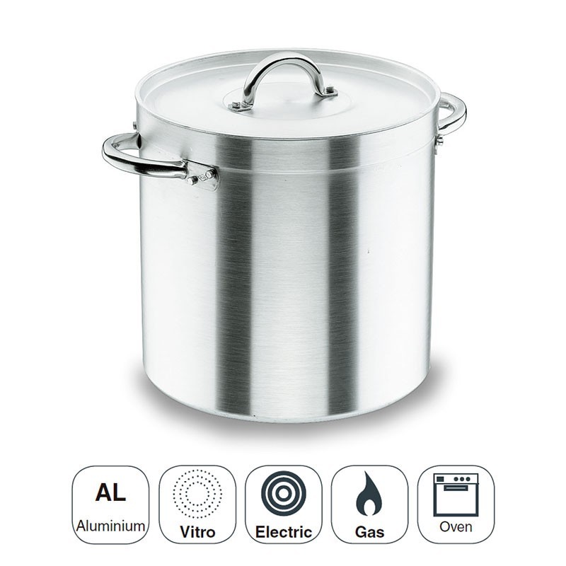 Olla recta profesional con tapa modelo Chef Aluminio fabricada en aluminio puro de alta calidad compatible con cocinas de gas, vitrocerámicas y eléctricas.