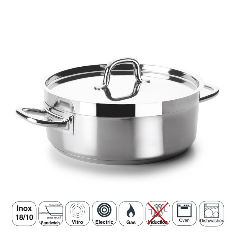 Cacerola profesional con tapa modelo Chef Luxe fabricada en acero inoxidable 18/10 con fondo termodifusor sándwich apto para placas de inducción, eléctricas, vitrocerámicas y cocinas de gas.