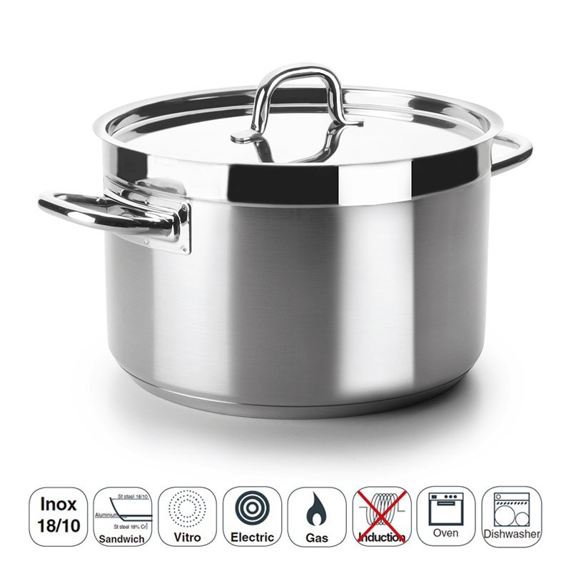 Cacerola profesional alta con tapa modelo Chef Luxe fabricada en acero inoxidable 18/10 con fondo termodifusor sándwich apto para placas de inducción, eléctricas, vitrocerámicas y cocinas de gas.
