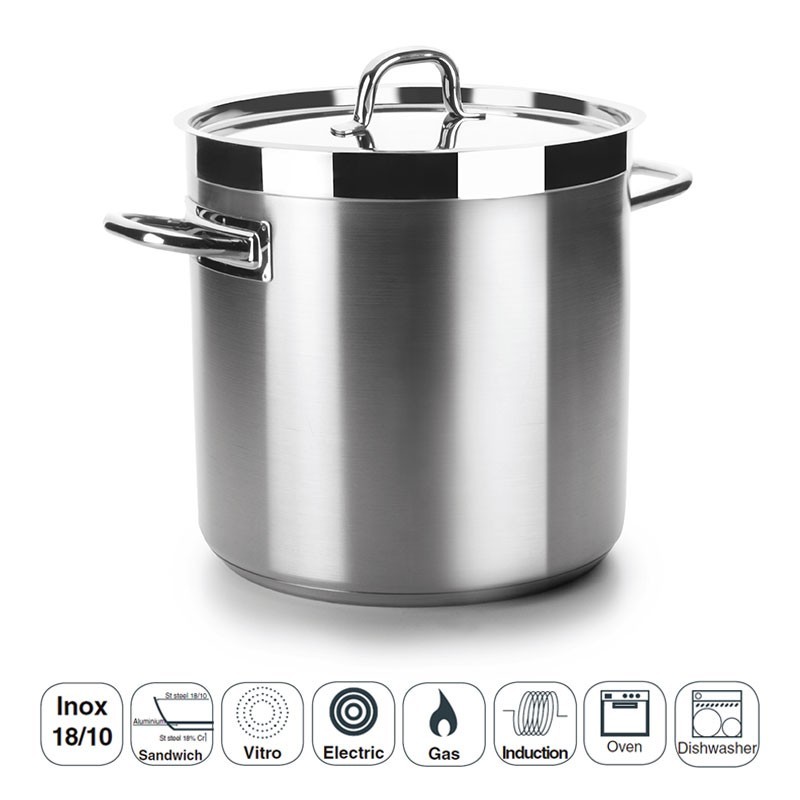 Olla profesional sin tapa modelo Chef Luxe fabricada en acero inoxidable 18/10 con fondo termodifusor sándwich apto para placas de inducción, eléctricas, vitrocerámicas y cocinas de gas.