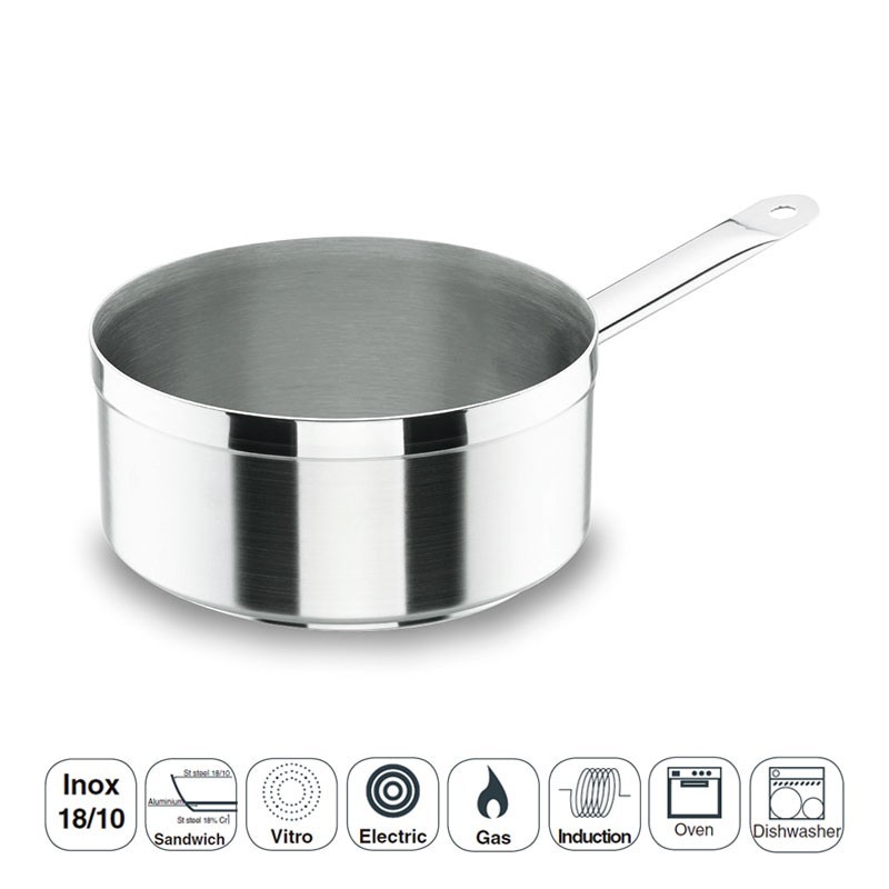 Cazo recto profesional modelo Chef Luxe fabricado en acero inoxidable 18/10 con fondo termodifusor sándwich apto para placas de inducción, eléctricas, vitrocerámicas y cocinas de gas.