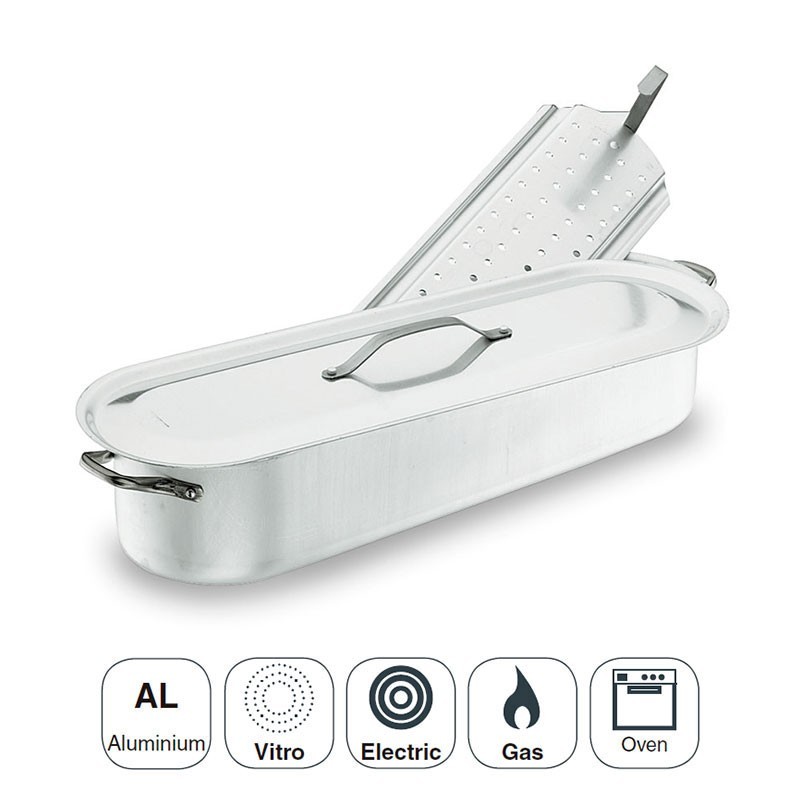 Hervidor de pescado profesional modelo Chef Aluminio fabricado en aluminio puro de alta calidad compatible con cocinas de gas, vitrocerámicas y eléctricas.