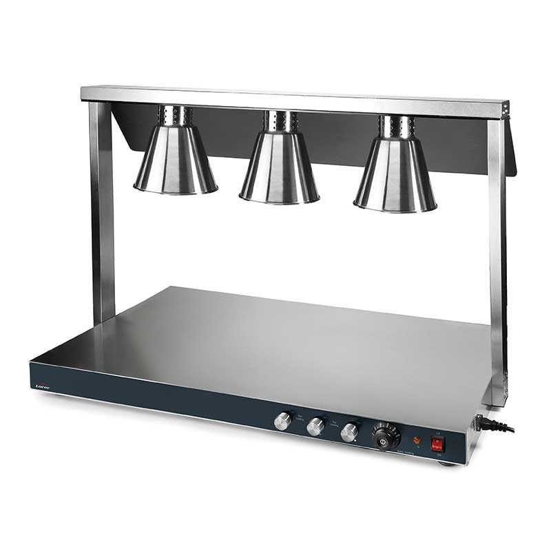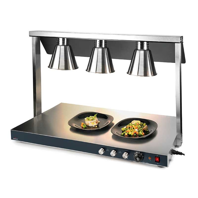 Placa de calentamiento eléctrica de acero inoxidable mas 3 lámparas halógenas en la parte superior para conseguir una temperatura homogénea.