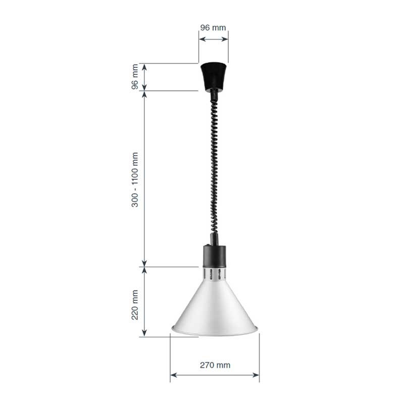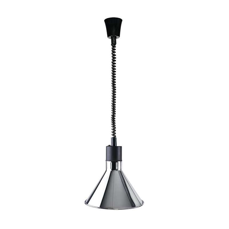 Lámpara cónica de infrarrojos para techo con cable extensible y bombilla de 275 W para mantener los platos calientes en cocinas profesionales.