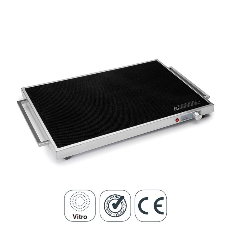 Placa de calentamiento eléctrica vitrocerámica de 230 W de potencia fabricada en cristal y acero inoxidable 18/10 de alta calidad y excelente resistencia a la corrosión. Ideal para hostelería y buffets.