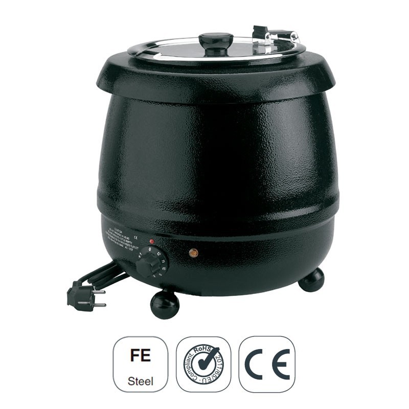 Olla calentador eléctrico de sopa de 10 L fabricada en hierro esmaltado negro de gran calidad, robustez y resistencia. Ideal para hostelería y buffets.