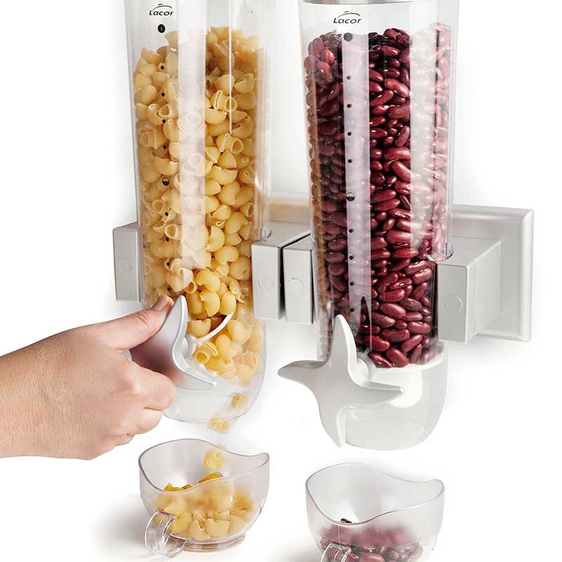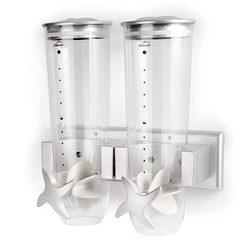 Dispensador doble de cereales para pared con sistema dispensador giratorio de fácil uso. Ideal para alimentos como cereales, copos de avena, pasta, café, frutos secos, etc.