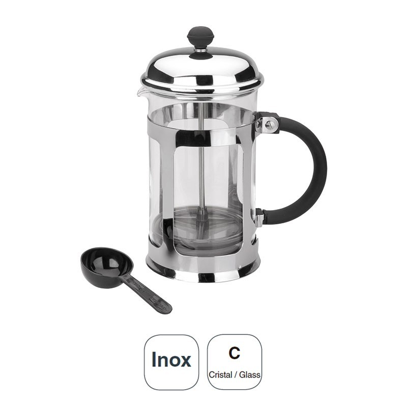Cafetera de émbolo fabricada en cristal y acero inoxidable 18% Cromo de alta calidad y excelente resistencia a la corrosión. Ideal también para preparar infusiones. Disponible en 2 tamaños.