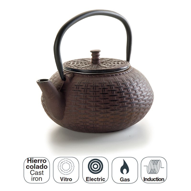 Tetera artesanal de hierro fundido de 0,8 litros con interior esmaltado para evitar la oxidación, infusor de acero inoxidable y asa antiquemaduras.